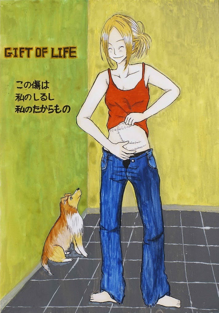 (下)「GIFT OF LIFE」「この傷は私のしるし、私のたからもの」という言葉と共に、前向きに生きる姿が描かれています。